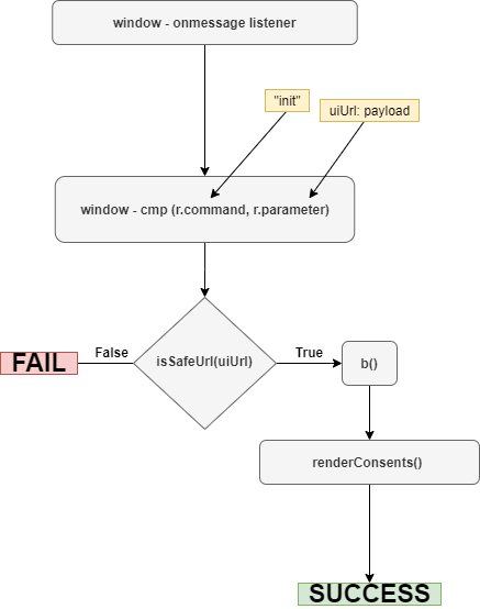 As you can see - renderConsents() is finally interesting element from security perspective, because it creates iframe element with src attribute controlled by attacker, that can be controlled by attacker. We can easy execute Javascript code using <iframe> element by providing code as URI (in src attribute) – by using special URI schema / protocol – javascript. By using <iframe src="javascript:alert(1)"></iframe> browser simply gonna execute alert(1) Javascript code. That was the reason why isSafeUrl() function was previously executed. So how we can still pass URL containing javascript schema at beginning?