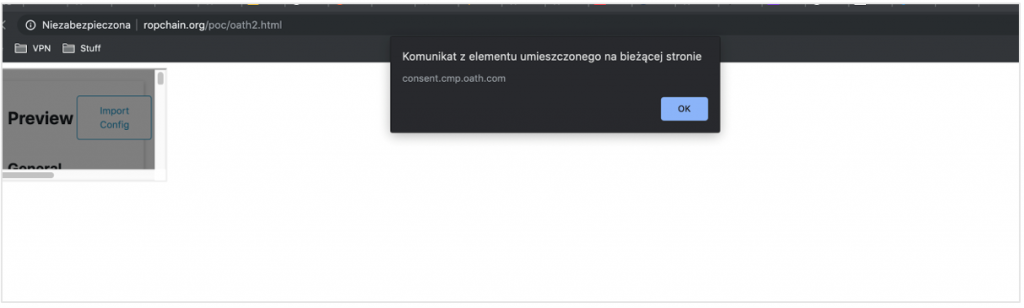 To pass this message into vulnerable page we also need to have a link to its window object, which can be easily achieved by putting vulnerable page into iframe. When we sum up all described steps, final Proof of Concept would look following: