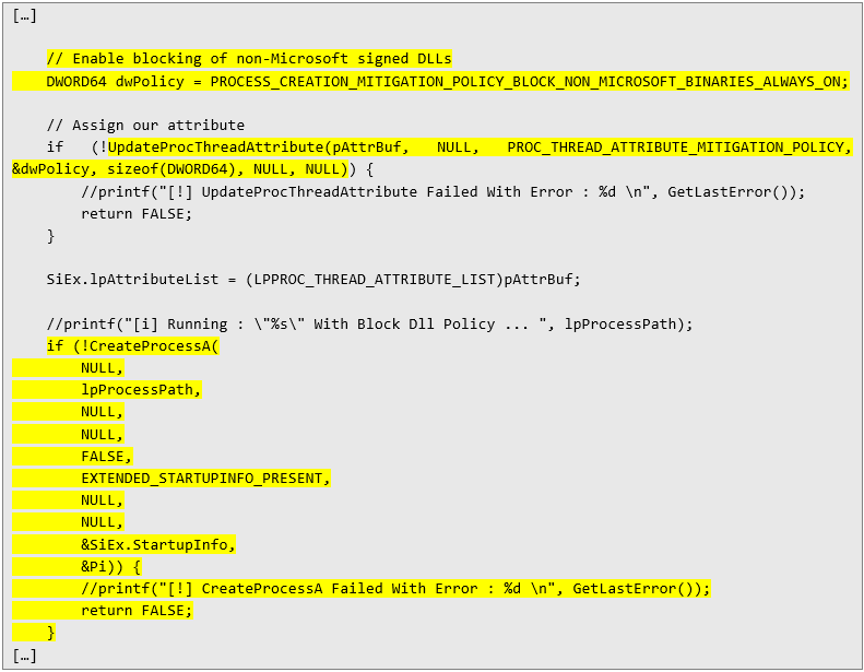 The third technique I used was creating my own process with a flag that disables the loading of libraries not signed by Microsoft. Below is the code snippet responsible for this: