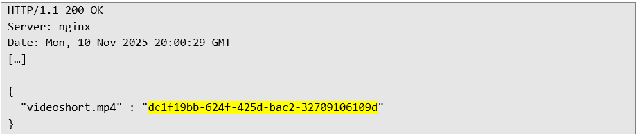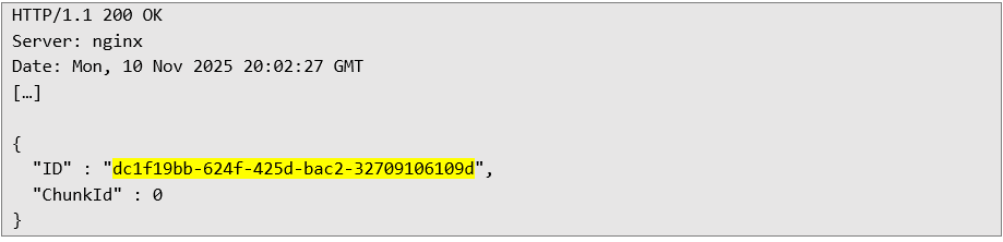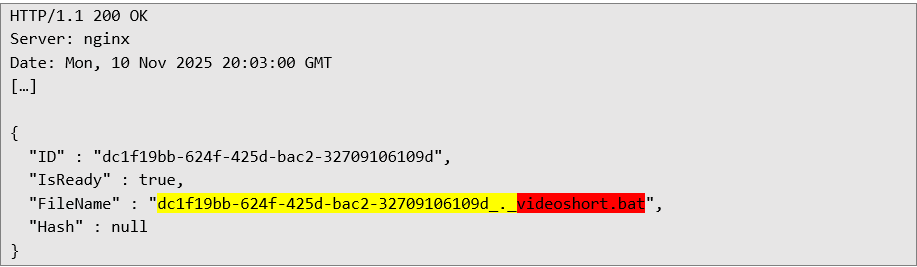 Server response confirming successful completion of the file transfer, the full name of the created file is highlighted in yellow, the extension specified in the first and second request does not matter in this case, the application will still create the file with the extension specified in the third file transfer request: