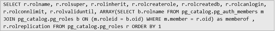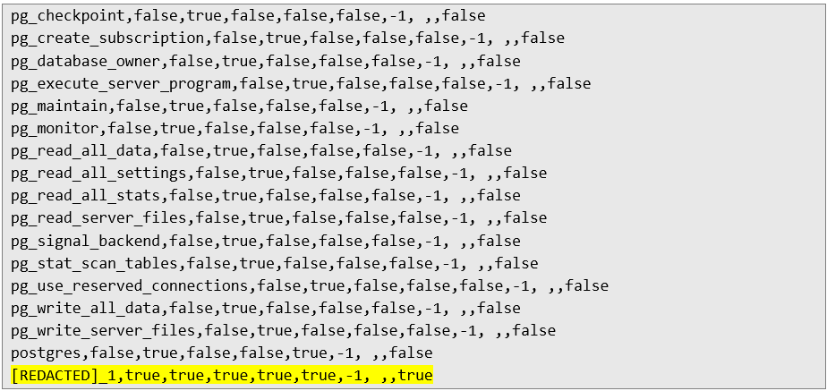 Therefore, the database user from which the previous database queries were executed has the following roles assigned in PostgreSQL: