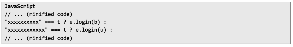 Inside the minified JavaScript code, a simple conditional check was responsible for handling the login. The code compared the user's input (t) against two hardcoded strings, one for an editor and one for an administrator: