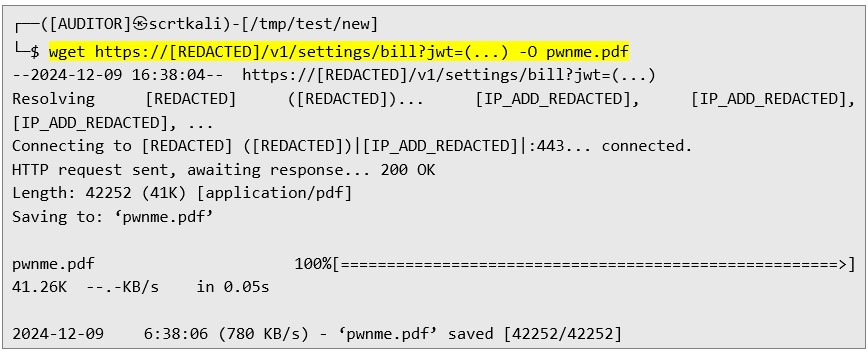 The following response demonstrates the server's acceptance of the malicious payload and initiation of PDF generation: